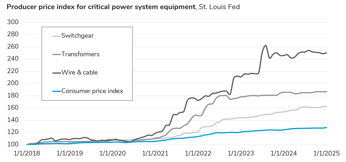 In “The Price of Power Grids” I charted the rising cost of critical power delivery equipment, including transformers, switchgear, and powerlines.