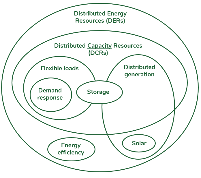 Distributed capacity resources (DCRs): A subset of DERs whose dispatch can be influenced or managed to provide reliable capacity to the grid.