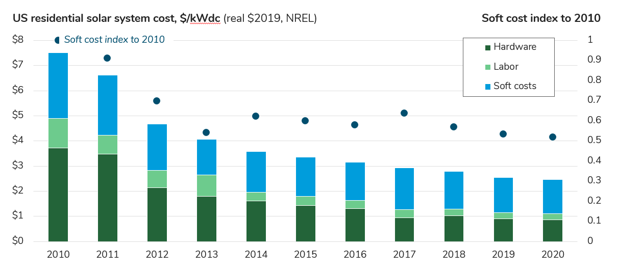 2. DERs cost too much. This may sound surprising, because the cost of all the core hardware in the DER ecosystem has fallen precipitously, and conspicuously. The cost of solar panels, lithium-ion batteries, and all manner of connected devices declined pretty steadily from 2010 onward. (Remember the “internet of things” and the “smart home”?) But what surprised many DER optimists was that the “soft costs” of DER deployment & integration did not follow suit.