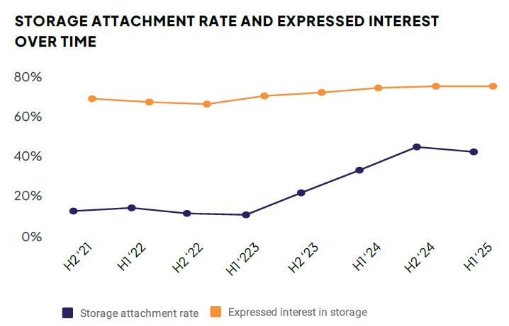 This appears to be what’s happening today. Here’s more data from EnergySage, which shows the share of solar customers who express interest in storage gradually climbing, and more importantly, the share who are actually acting on that interest beginning to take off around the beginning of 2023. (“Attachment rate” has become industry shorthand for the share of solar customers who also opt to add a battery.)